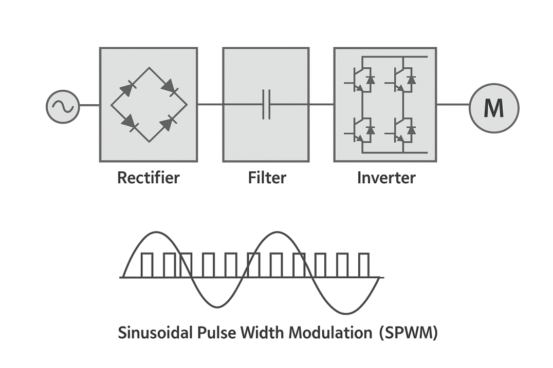 Variabel Frequency Drive (VFD) merupakan gabungan dari rectifier dan inverter, di mana rectifier berfungsi sebagai pengubah tegangan AC dengan frekuensi tetap menjadi tegangan DC dan inverter berfungsi sebagai pengubah tegangan DC menjadi AC dengan frekuensi variabel yang dapat diatur. VFD melakukan konversi dari tegangan AC frekuensi tetap menjadi AC frekuensi variabel dengan cara mengubah menjadi tegangan DC terlebih dahulu melewati rectifier kemudian menjadikannya variabel frekuensi melalui inverter