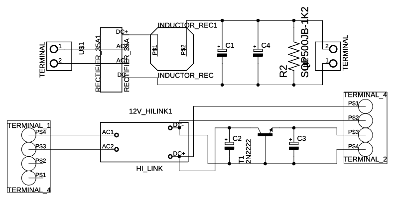 Berikut adalah desain rangkaian power supply. Untuk tegangan tinggi digunakan input 220 VAC yang akan disearahkan atau diubah dalam bentuk DC melalui rectifier H-Bride dioda. Setelah itu tegangan akan difilter mengunakan LC filter sebelum masuk ke rangkaian inverter untuk kembali dikonversi kedalam tegangan AC dengan frekuensi variabel. Selanjutnya untuk rangkaian input kontroler digunakan tegangan rendah 12V dengan memanfaatkan komponen Hi-link yang mampu mengkonversi tegangan AC 220V menjadi DC 12V.
