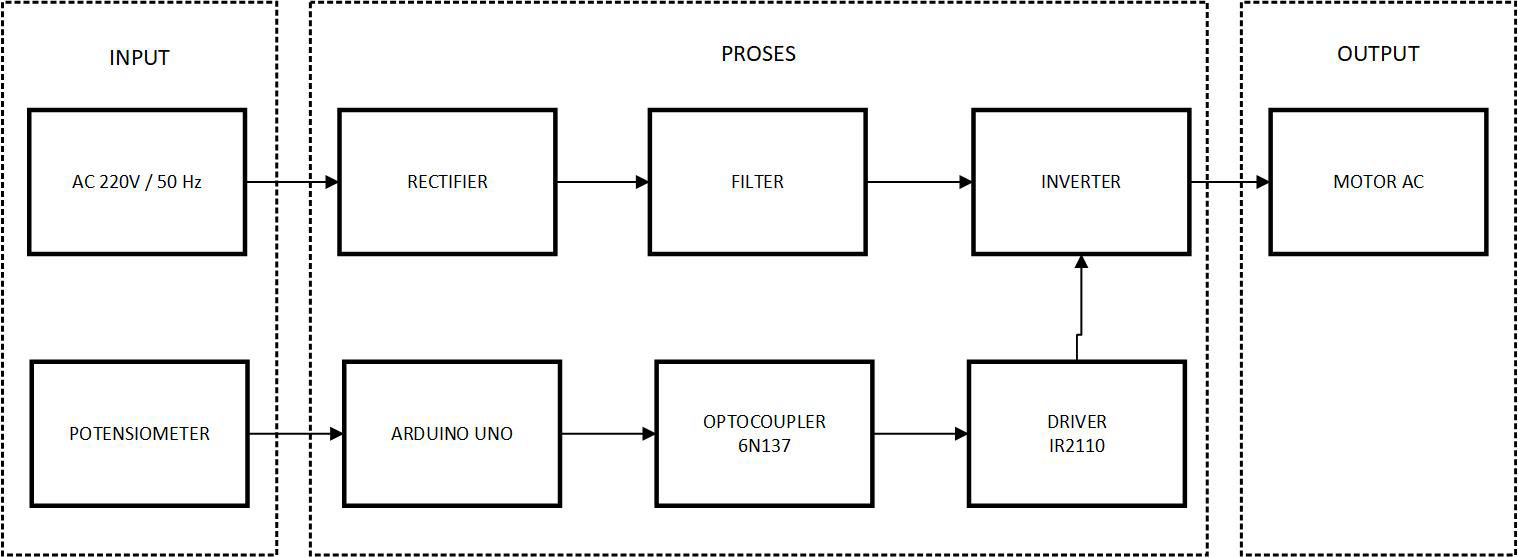 Variabel Frequency Drive (VFD) merupakan gabungan dari rectifier dan inverter, di mana rectifier berfungsi sebagai pengubah tegangan AC dengan frekuensi tetap menjadi tegangan DC dan inverter berfungsi sebagai pengubah tegangan DC menjadi AC dengan frekuensi variabel yang dapat diatur. VFD melakukan konversi dari tegangan AC frekuensi tetap menjadi AC frekuensi variabel dengan cara mengubah menjadi tegangan DC terlebih dahulu melewati rectifier kemudian menjadikannya variabel frekuensi melalui inverter