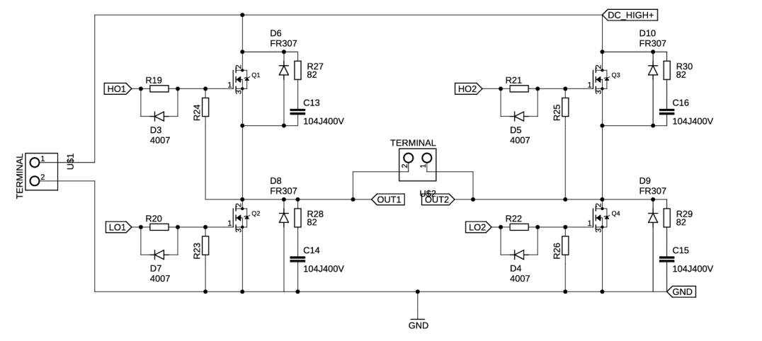 Pada rangkaian Inverter menggunakan dua pasang MOSFET atau empat buah MOSFET yang berfungsi sebagai saklar dengan konfigurasi full bridge, MOSFET yang digunakan adalah tipe IRF840 yang memiliki tegangan Drain-Source sebesar 500V dan arus Drain sebesar 8A. Pada masing-masing MOSFET digunakan pengaman lonjakan tegangan karena beban induktif berupa diode yang dipasang parallel pada pin sourch dan drain MOSFET dan sebuah rangkaian RC Snubber. Untuk penyulutan inverter terdapat empat masukan pada masing-masing kaki Gate MOSFET yaitu HO1, LO1, HO2 dan LO2.
